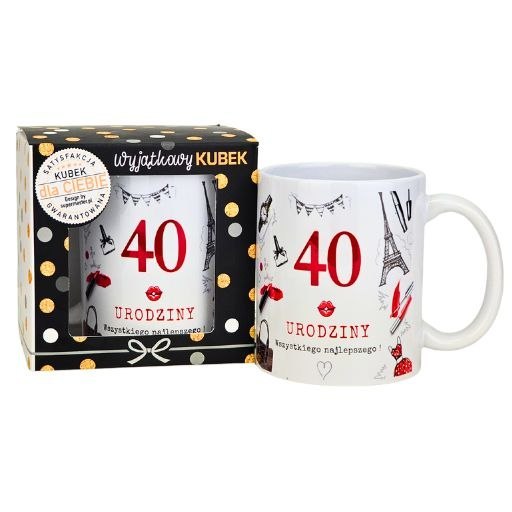 Taki kubek 40-stkowy sprawdzi się nie tylko jako prezent od rodziny, lecz również jako upominek od przyjaciół, koleżanek czy znajomych. Dzięki uniwersalnemu wzorowi oraz trwałemu wykonaniu będzie cieszył obdarowaną osobę przez długie lata.
