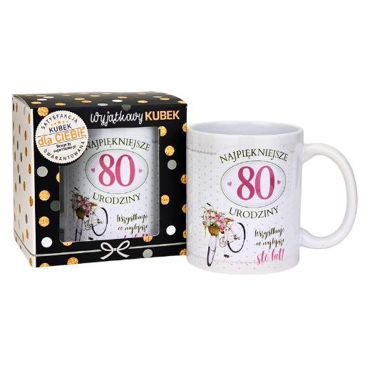 Taki kubek 80-stkowy sprawdzi się nie tylko jako prezent od rodziny, lecz również jako upominek od przyjaciół, koleżanek czy znajomych. Dzięki uniwersalnemu wzorowi oraz trwałemu wykonaniu będzie cieszył obdarowaną osobę przez długie lata.