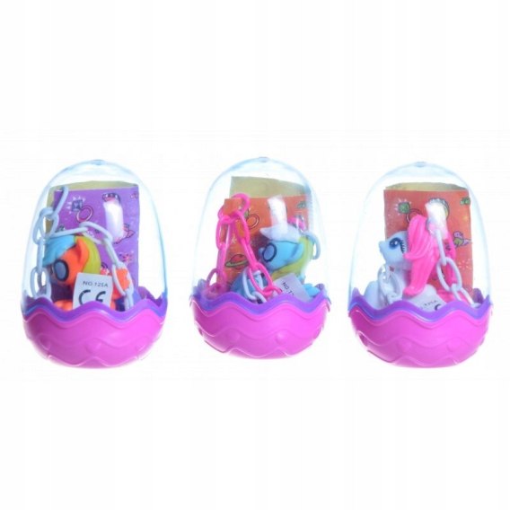 Mały konik pegaz umieszczony w przezroczystym otwieranym jajku .Do konika przyczepiony jest łańcuszek i można sobie go powiesić na szyi lub nosić na ręku. Do zestawu zostały dołączone naklejki.