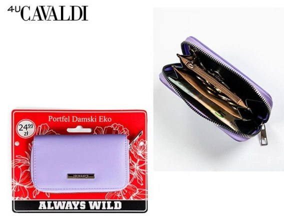 • Kompaktowy portfel damski na gotówkę w fioletowym kolorze. Portfelik wykonany ze skóry ekologicznej. Wyposażony w trzy przegródki na banknoty i jedną na bilon. Dodatkowo wewnątrz jednej przegródki wszyte kółeczko na klucze. 2w1 portfel - etui.
