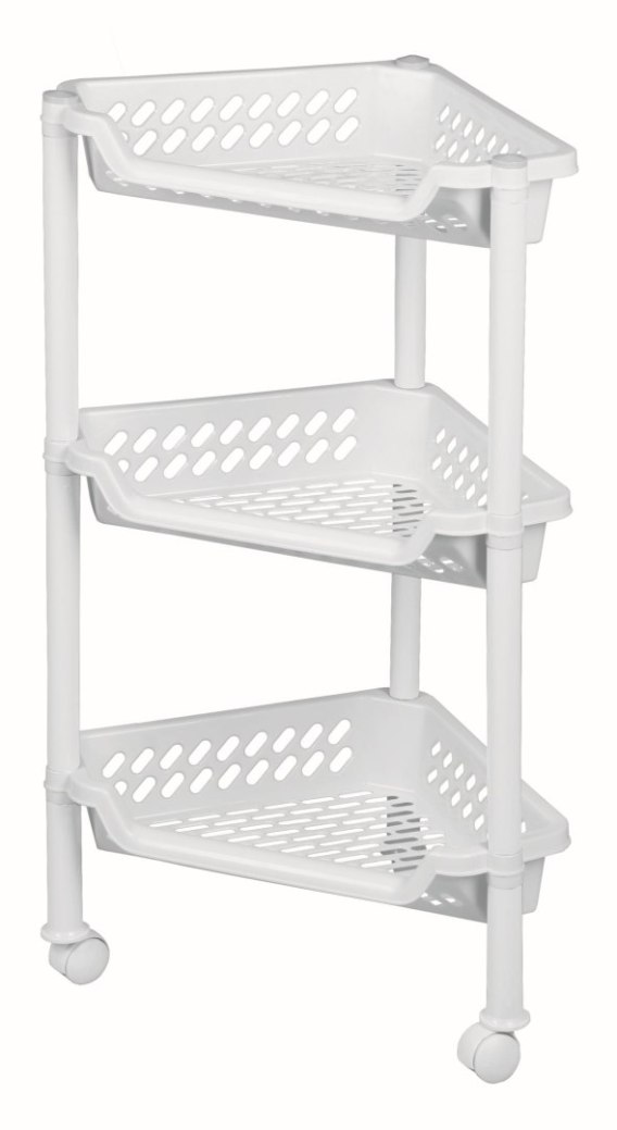 Trójkątny regał idealnie wpasuje się w narożnik pomieszczenia. Regał wyposażony w trzy półki z otworami zapewniającymi lepsze odprowadzanie wody i wentylację w miejscach wilgotnych takich jak łazienka. Regał został wyposażony w kółka ułatwiające przemieszczanie wózka.