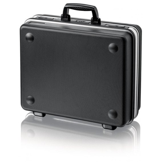 Dno walizki o wysokości 50 mm, które można mocować za pomocą przycisku, możliwość dalszego podziału za pomocą przekładek, panel pokrywy z 12 dużymi kieszeniami na narzędzia i jedną płaską komorą