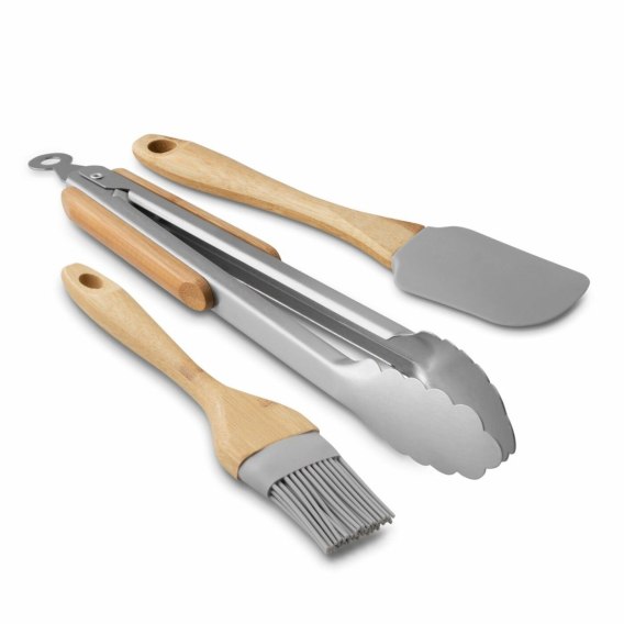 Komplet zawiera metalowe szczypce, łopatkę kuchenną i silikonowy pędzelek