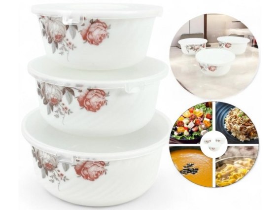 Funkcjonalne pokrywki: każda miska wyposażona jest w praktyczną plastikową pokrywkę, która pozwala na łatwe przechowywanie żywności w lodówce, ochronę przed wysychaniem i przenoszenie potraw bez ryzyka rozlania. Świetnie sprawdzą się zarówno do przechowywania resztek obiadu, jak i do przygotowywania posiłków z wyprzedzeniem.